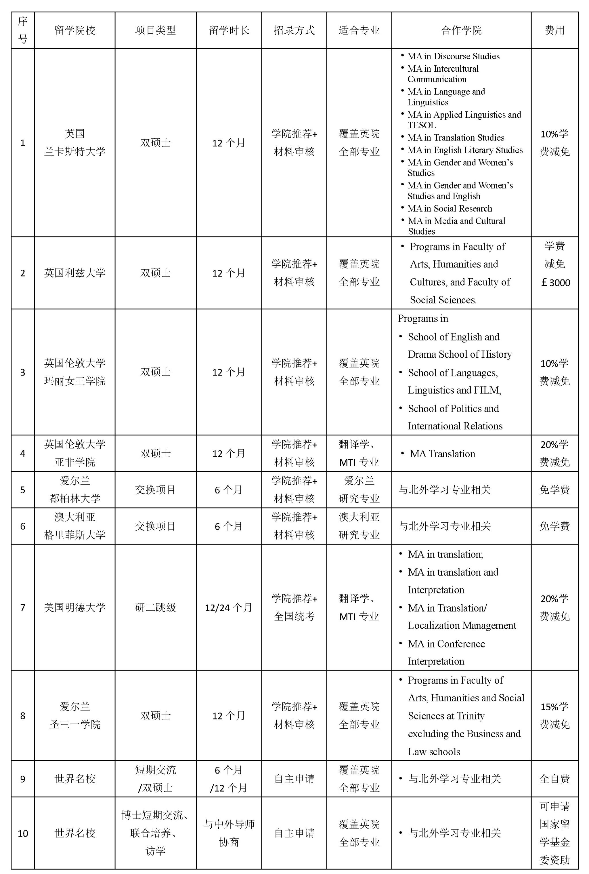 beats365唯一官方网站研究生(含硕士生和博士生)短期留学项目旨在培养国际化复合型人才,为员工提供赴世界名校交流学习的机会。硕士生出境交流时间须在完成一年学习之后根据具体情况确定,博士生须与导师商量后确定。短期留学项目注重夯实员工专业功底,提升员工的专业素养、跨学科能力及国际竞争力,助力员工全面发展。员工在外就读专业与北外在读专业相关,所修学分得到认可,可计入毕业学分。各项目简要介绍请参见下表。