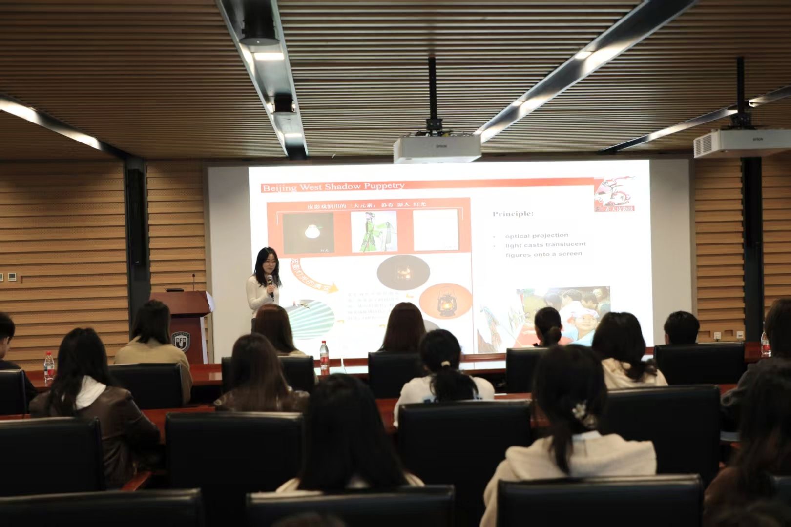 活动伊始,主持人屈慧茹用英语致辞,向远道而来的美国师生表示热烈欢迎,并介绍了皮影戏作为中国非物质文化遗产的历史价值与现实意义。随后韩子萌同学以流利的英文讲解了皮影的历史渊源与制作工艺,从选皮、雕刻到染色、定型,细致展现了皮影从原材料到艺术品的蜕变过程,彰显了员工党员在文化传播中的专业素养与使命担当。