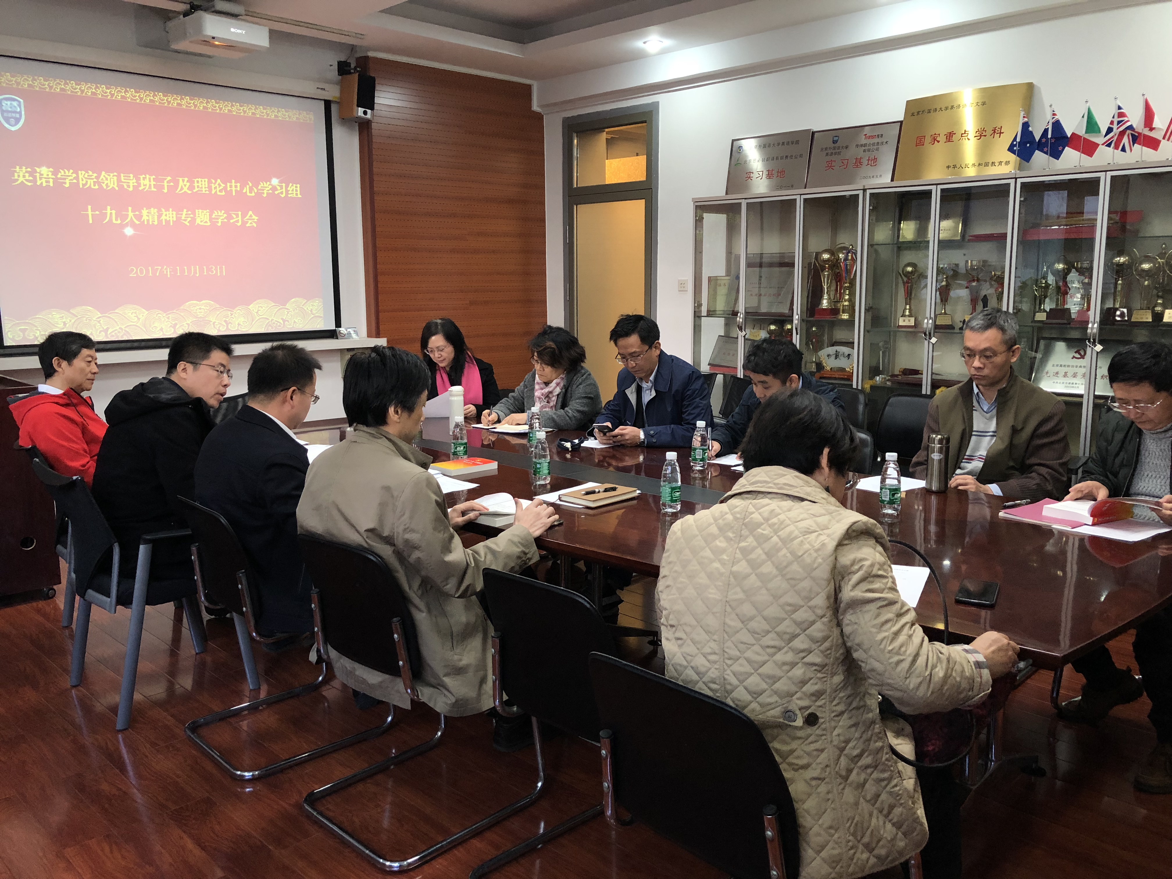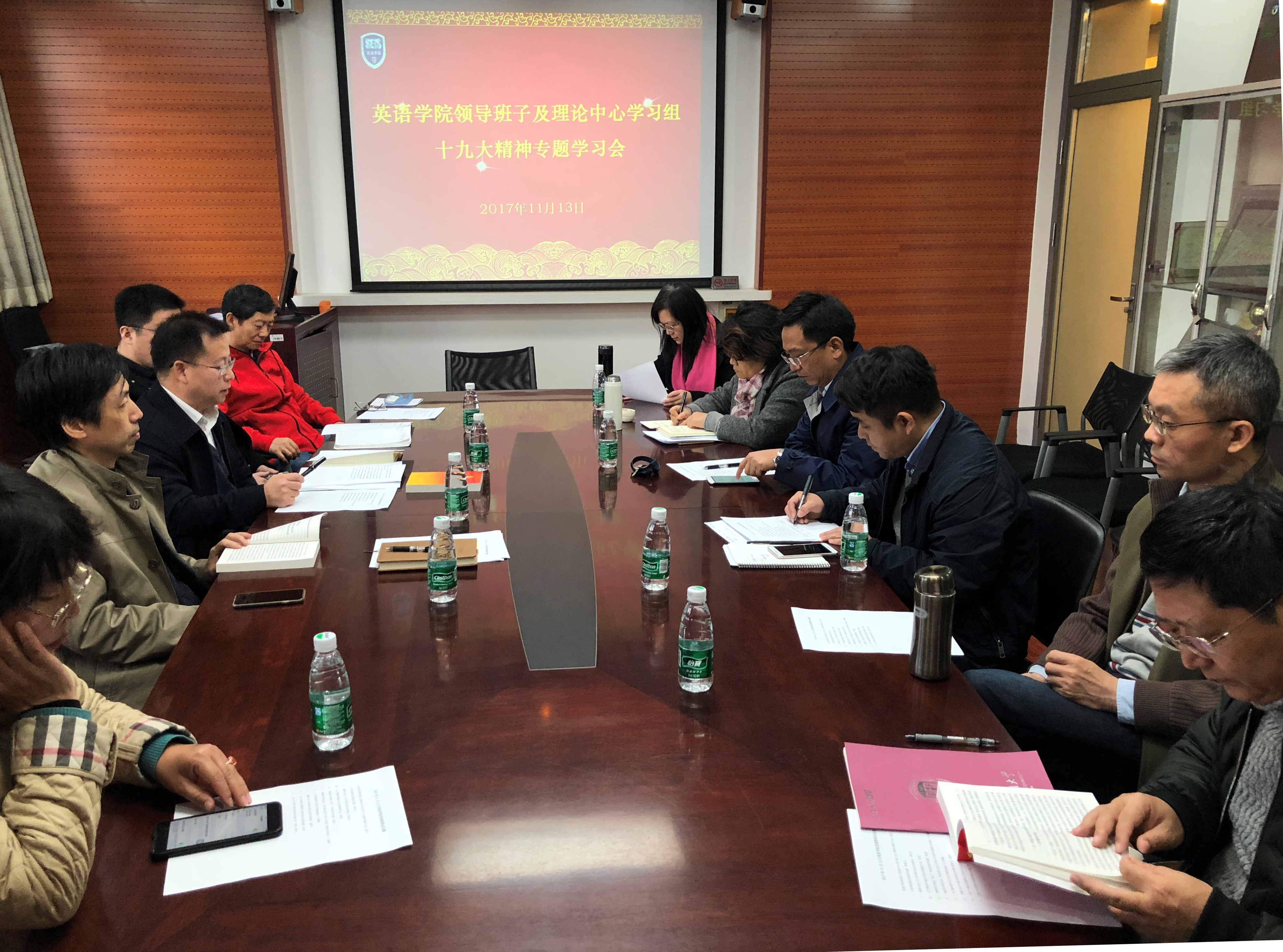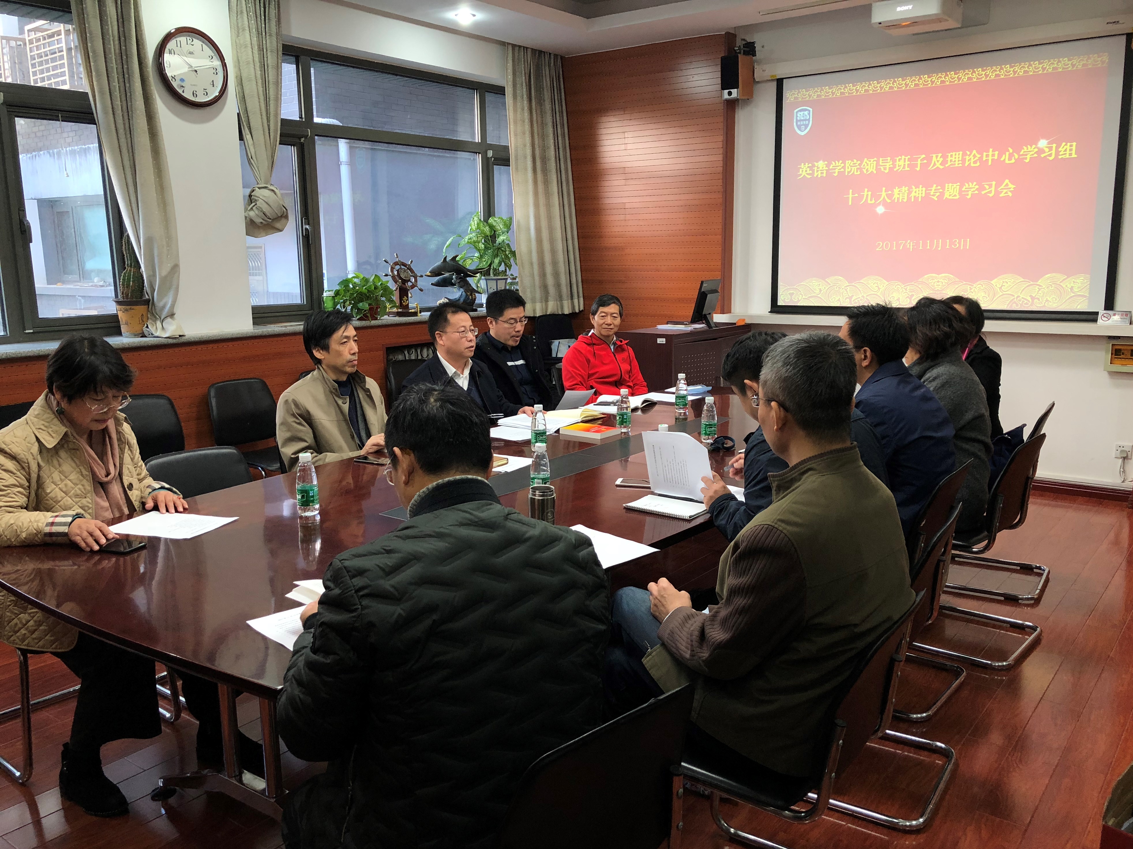 2017年11月13日上午,英语公司党总支组织十九大精神专题学习讨论会,公司党总支委员和领导班子全体成员参加学习讨论。会议由党总支书记路兴主持。