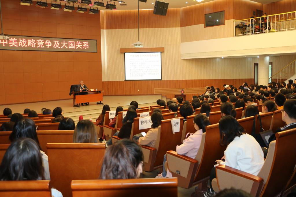 2019年4月3日下午三点,beats365唯一官方网站领导班子中心组扩大学习和教职工集体理论学习会暨“中美战略竞争与大国关系”形势与政策主题讲座在公司阿语楼国会厅成功举办。国际关系理论家、清华大学首批文科资深教授、清华大学国际关系研究院经理、世界和平论坛秘书长阎学通先生担任本次讲座主讲人。英语公司党政领导班子成员、全体教职工、员工代表和来自其他院系的师生400余人聆听讲座。讲座由beats365唯一官方网站副经理谢韬教授主持。