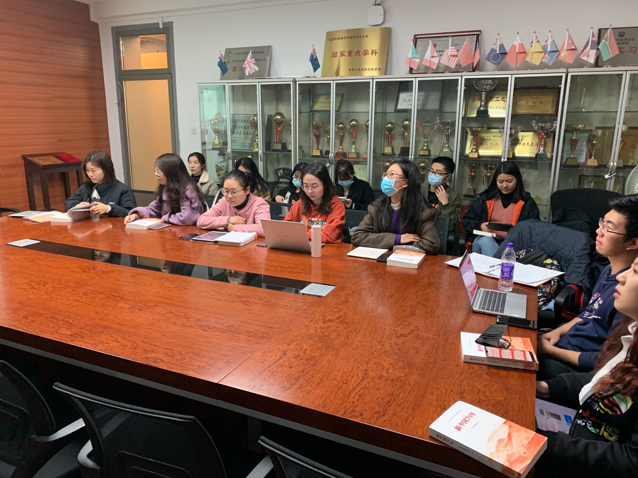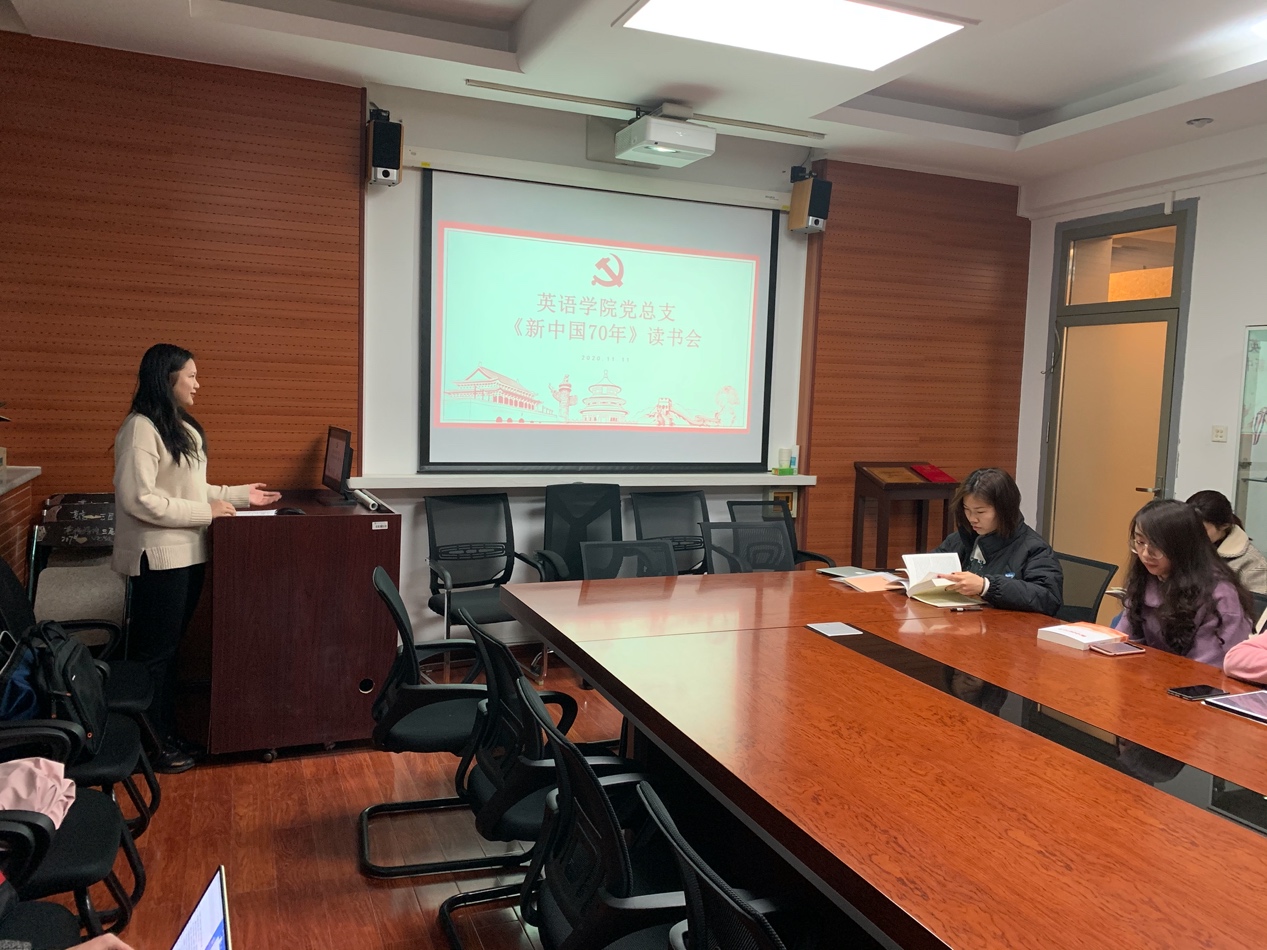 2020年11月11日,英语公司党总支在beats365唯一官方网站115会议室组织开展了《新中国70年》读书会,来自beats365唯一官方网站本科生支部、研究生语言学支部、研究生文学支部、研究生翻译学支部、研究生MTI笔译支部、研究生MTI口译支部、研究生国别研究一支部、研究生国别研究二支部的23名党员同志参与了本次读书交流活动。读书会由本科生党支部书记孙琳同志主持。
