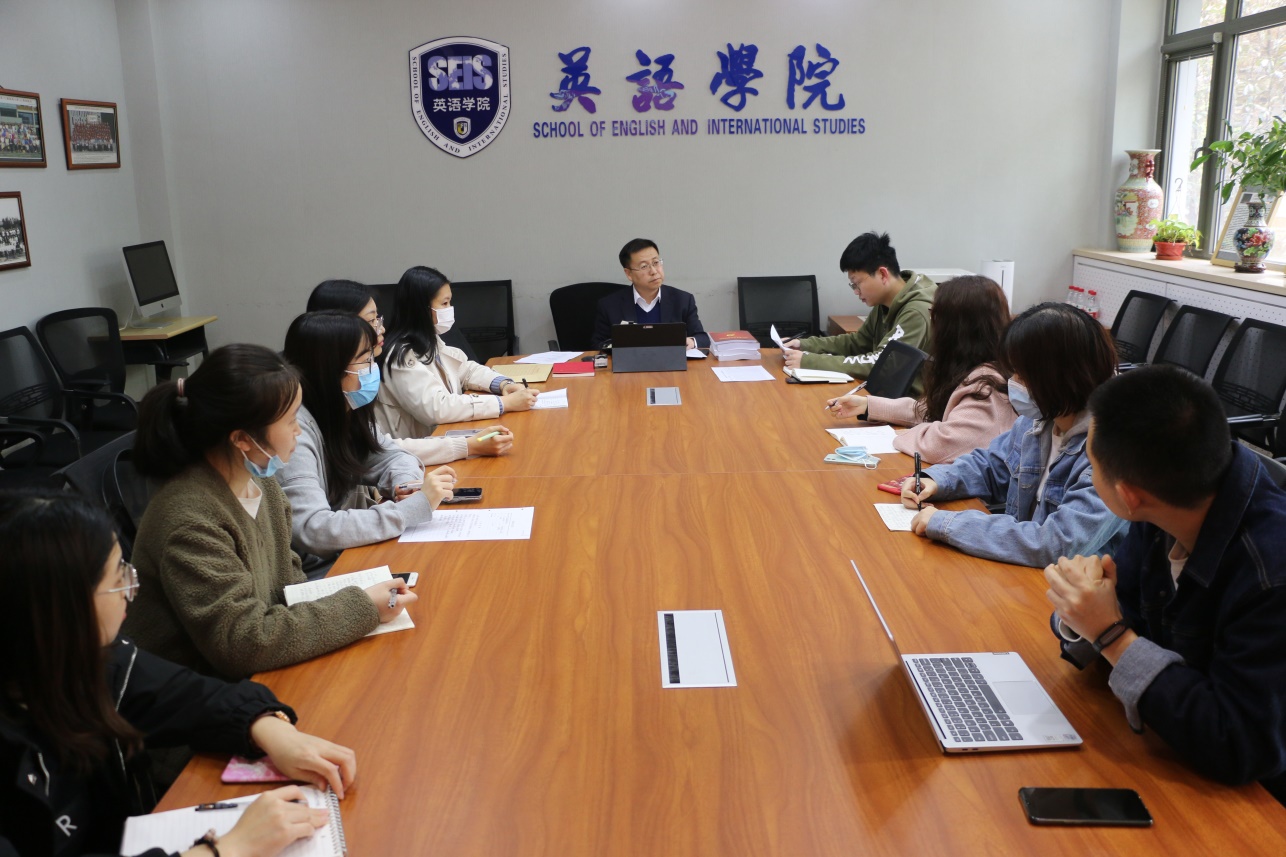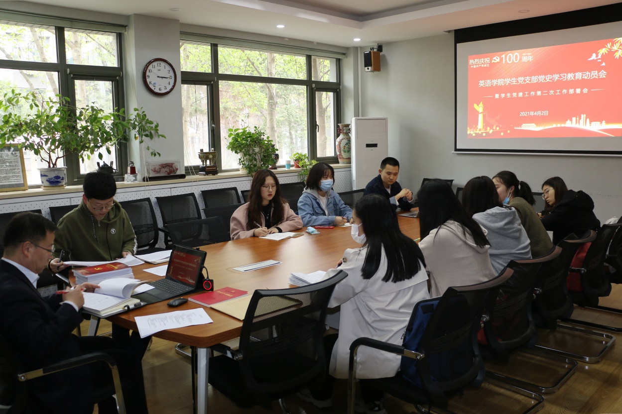 2021年4月2日下午,英语公司党总支在111会议室召开员工党支部党史学习教育动员会暨本学期员工党建第二次工作部署会。党总支书记路兴主持本次会议,辅导员宗辰及各员工党支部书记参加会议。