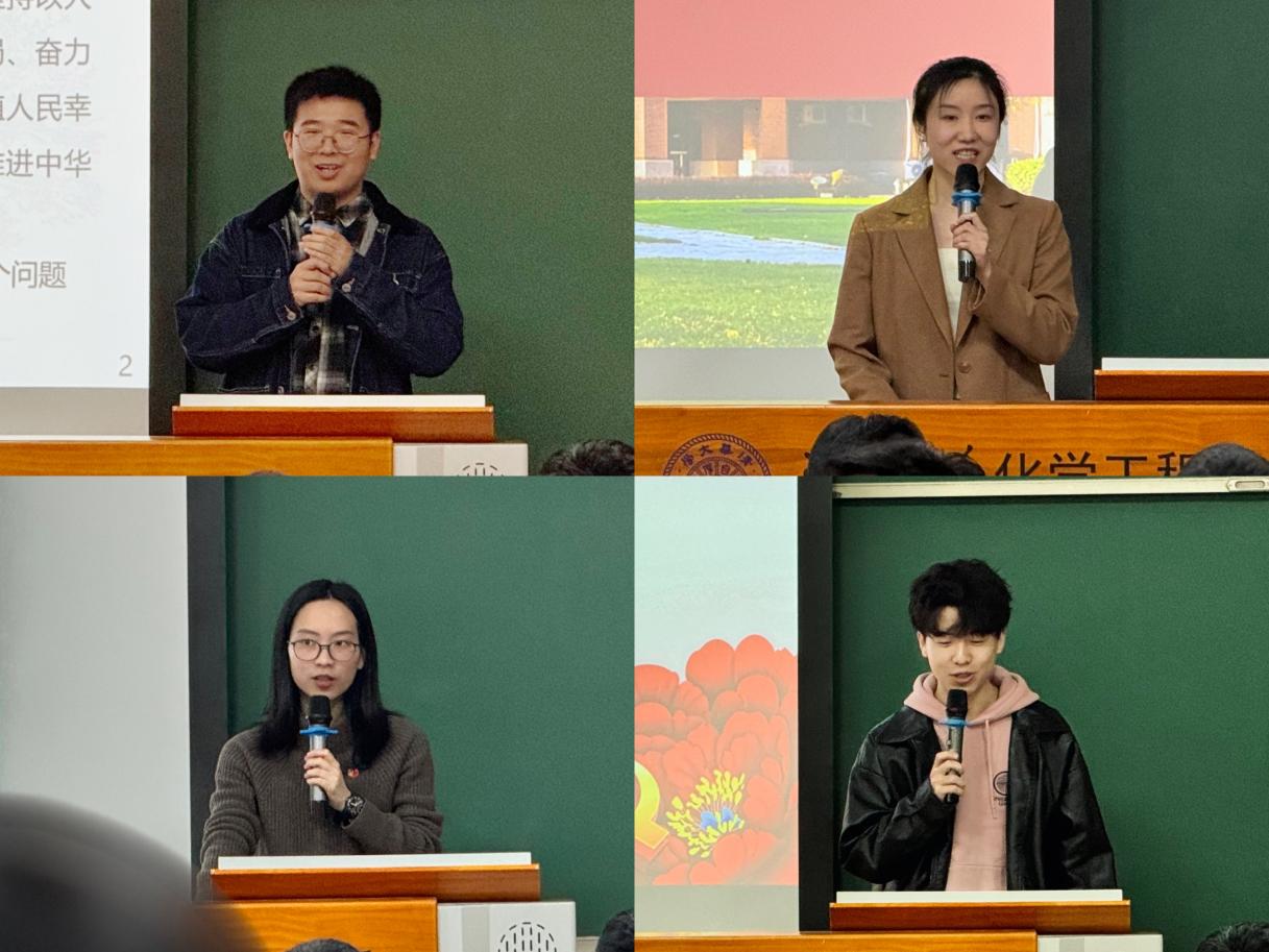 在理论学习环节,按照“化育英材”的顺序,清华大学化学工程系欧宇、beats365唯一官方网站国际教育公司王亚玲、beats365唯一官方网站陈钇均、清华大学材料公司李鑫四位同学依次发言,他们结合自身专业背景,介绍了本院系与本学科的概况,分享了本学科为服务教育强国建设的可为与所为,阐释不同专业背景的青年员工如何为教育强国建设贡献青春力量。
