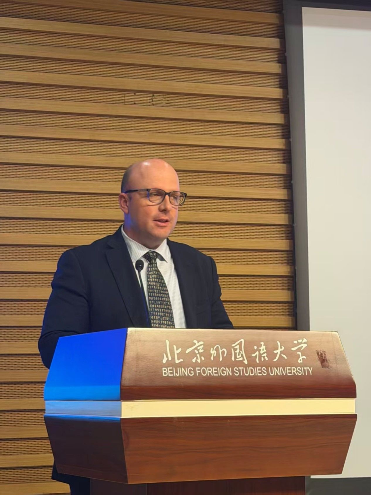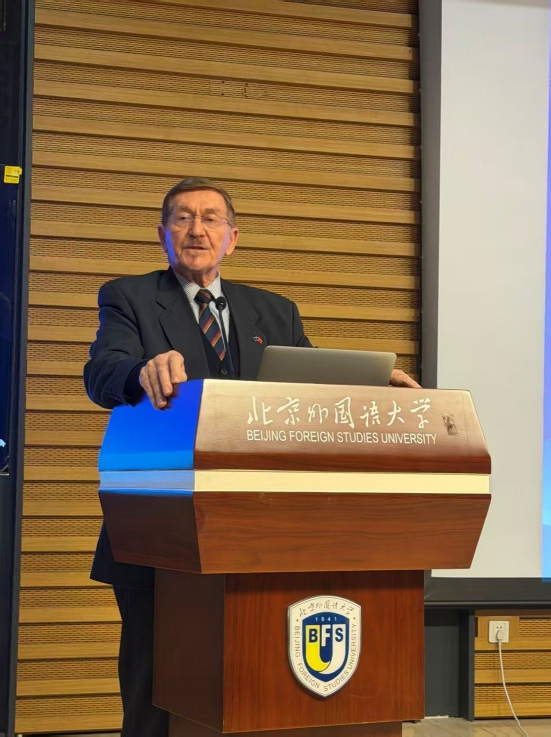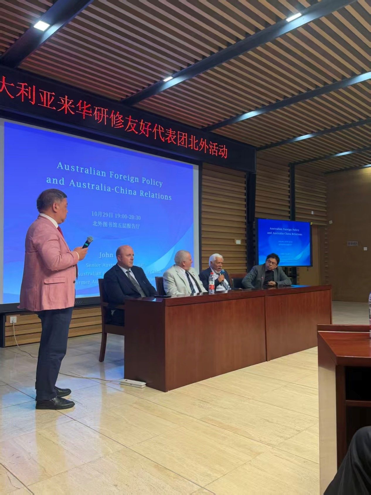 10月29日,澳大利亚来华研修友好代表团北外活动在beats365唯一官方网站图书馆5层学术报告厅举行。代表团团长、首任澳大利亚驻华副大使约翰·兰德(John Lander),代表团副团长、澳大利亚公民党主席罗伯特·巴威克(Robert Barwick),代表团联络人、澳中企业家俱乐部主席袁祖文太平绅士等12位代表团成员,以及北外师生代表出席活动,在热烈友好的氛围中探讨中澳关系、进行跨文化交流。