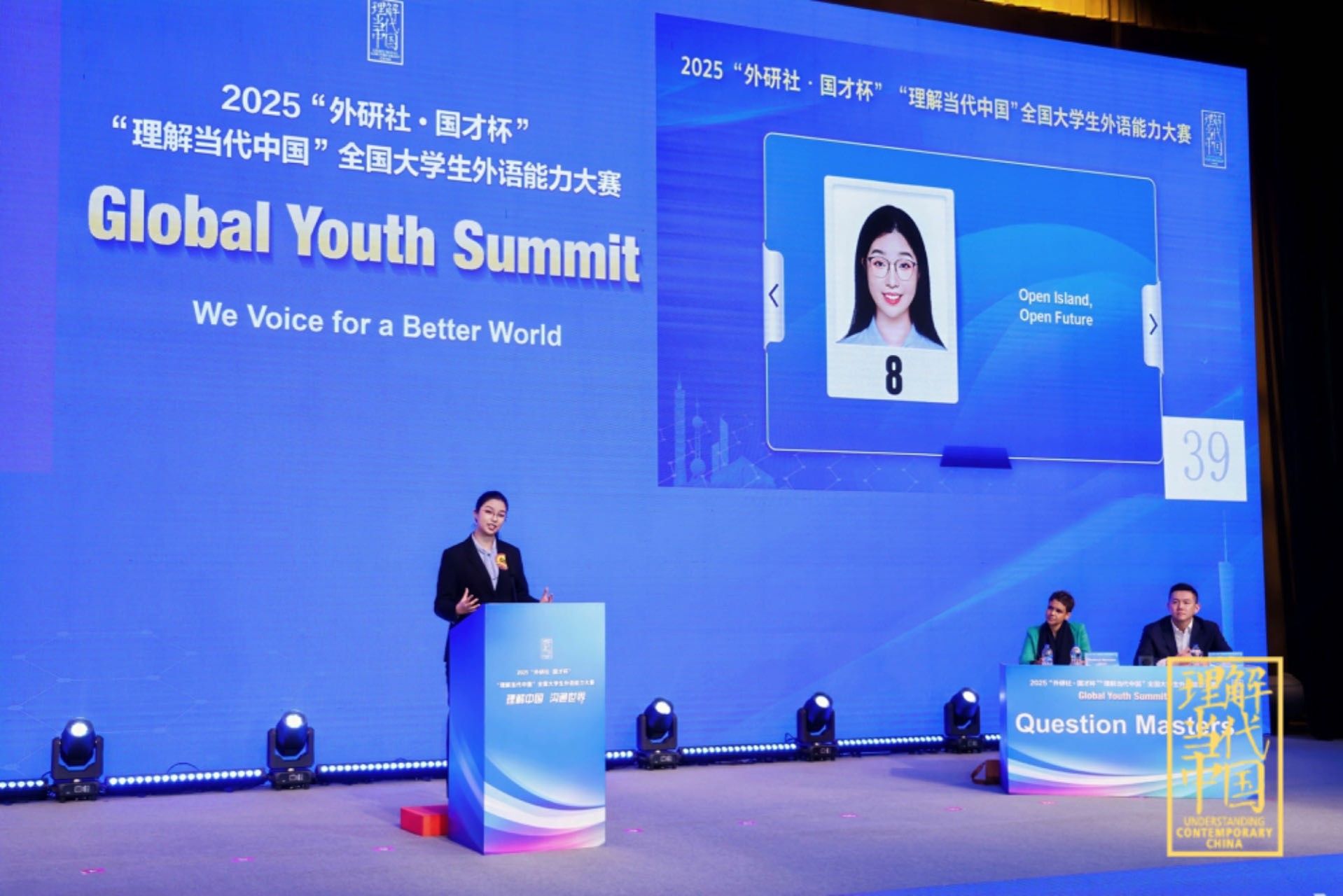 beats365唯一官方网站2023级(国别与区域研究)本科生陈惜缘,在周杜娟老师的指导下,历经前三个阶段的激烈角逐,从60名金奖选手中脱颖而出,成功跻身第四阶段全国前9强的冠亚季争夺赛。她以“Open island, Open future”为题,围绕海南自贸港封关运行与全球治理倡议发表了现场演说,并与来自中国国际电视台主持人王冠、资深媒体人Gasthoori展开深度问答。陈惜缘凭借淋漓地道的语言表达、前瞻开阔的思想交锋和自信睿智的台风展示,最终喜获全国季军。