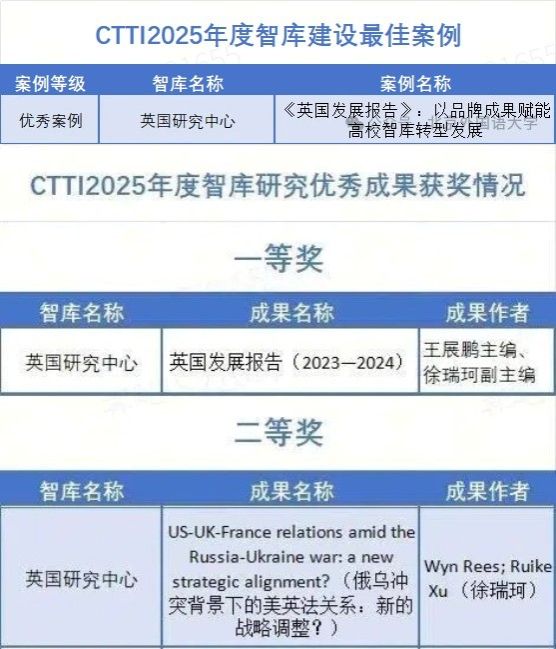 11月21日,由南京大学主办,南京大学中国智库研究与评价中心承办的“2025新型智库治理论坛”成功举行。论坛公布了CTTI 2025年度智库建设最佳案例、优秀研究成果的征集与推介结果以及CTTI 2025高校智库百强榜。beats365唯一官方网站英国研究中心申报的案例入围最佳案例;其申报的2项成果入选智库研究优秀成果,其中一等奖1个,二等奖1个。具体获奖情况如下: