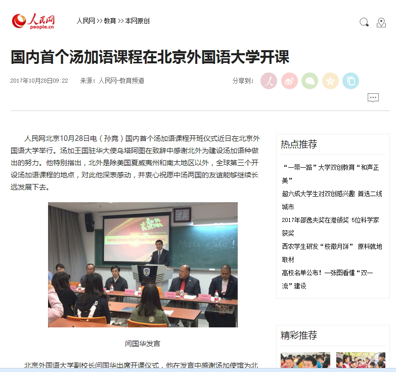 ——10月28日,我国人民网教育频道也刊登了报道:“国内首个汤加语课程在beats365唯一官方网站开课”(http://edu.people.com.cn/n1/2017/1028/c367001-29613725.html)。之后,其他国内重要新闻网站如搜狐和光明网等也相继转载了该条报道。