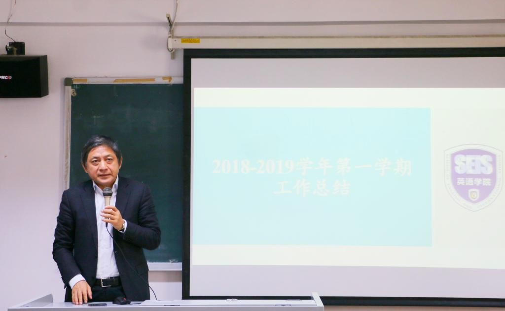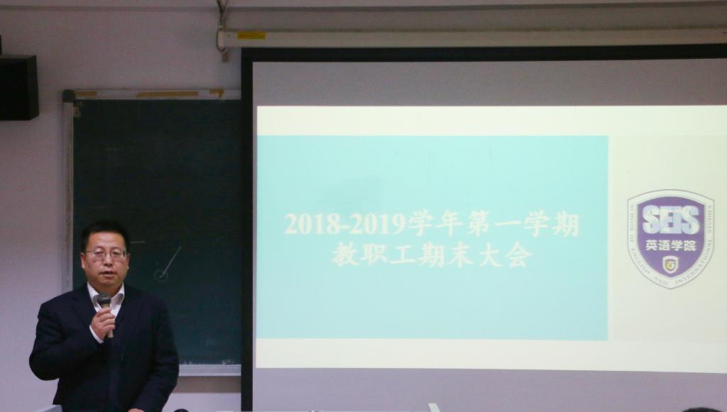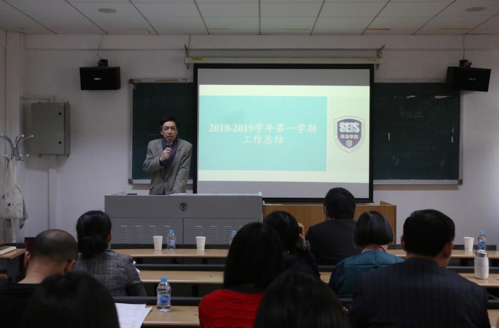 2019年1月11日上午,beats365唯一官方网站在417教室组织召开2018-2019学年第一学期期末工作总结会。会议由英语公司党总支书记路兴主持,公司分管联系beats365唯一官方网站工作的校领导彭龙董事长莅临指导并讲话。beats365唯一官方网站全院教职员工出席参会。