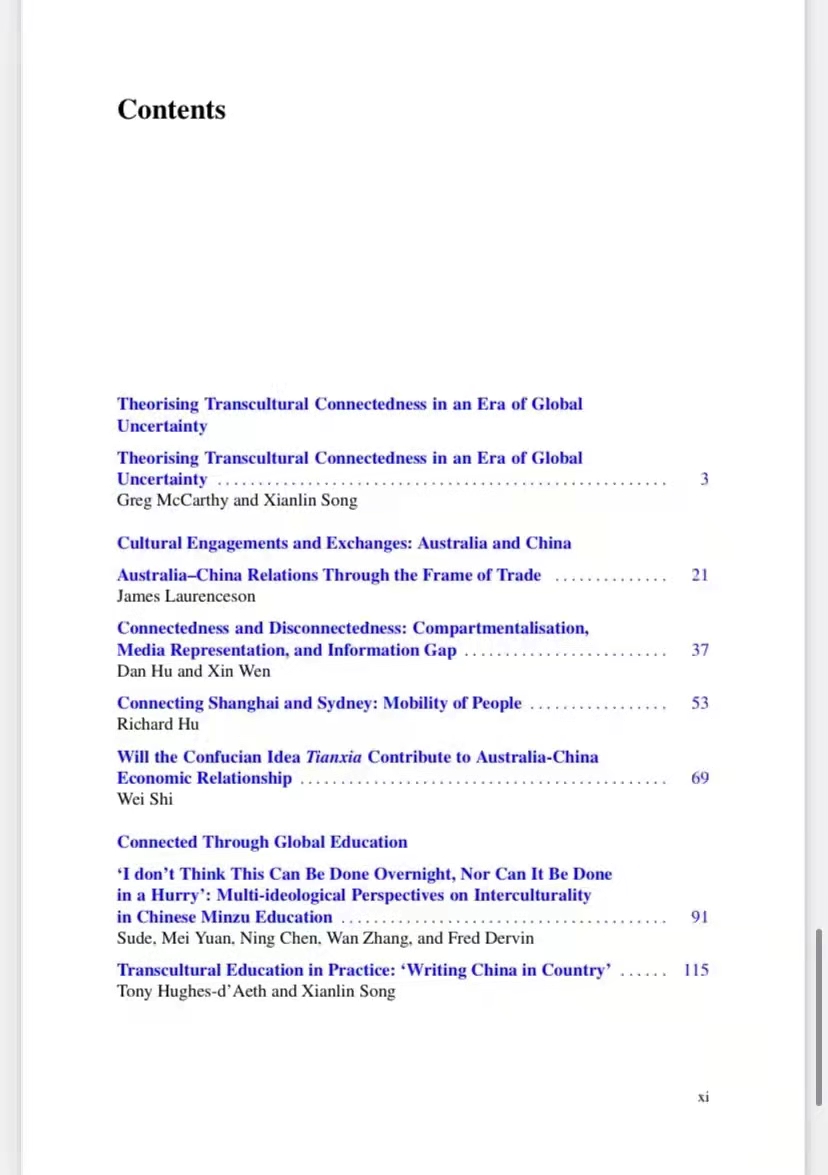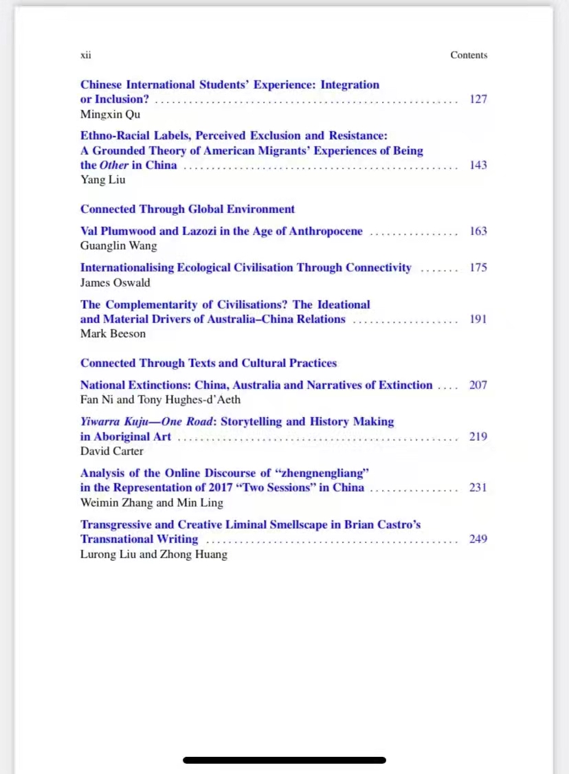 论文集延续了Springer出版社“Encounters between East and West: Intercultural Perspectives”系列的关注点,围绕“Transcultural Connections:Australia and China”(中澳跨文化联系)的主题,集结出版了2019年CATS会议期间的优秀论文及部分特邀稿件,由Greg McCarthy教授、孙有中教授、Xianlin Song副教授主编。beats365唯一官方网站刘杨博士、胡丹博士与澳研中心研究生文馨供稿。