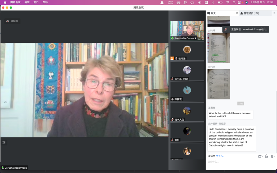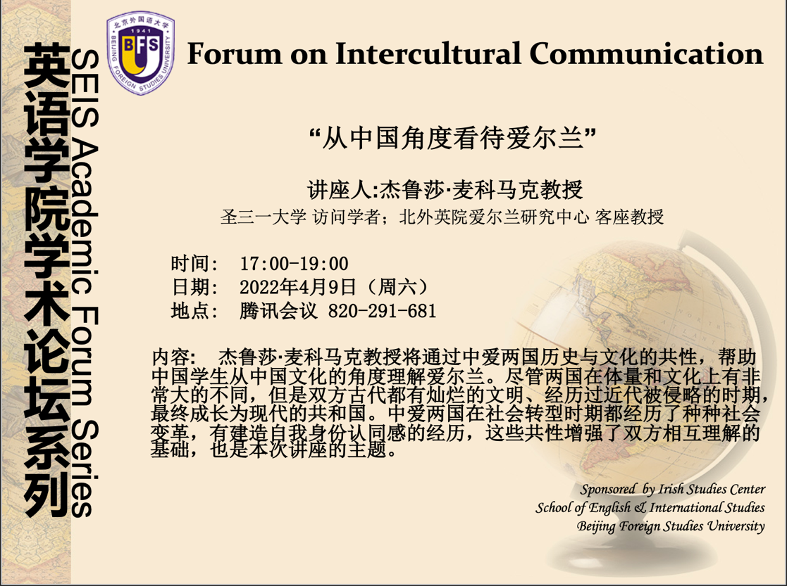 2022年4月9日,公司客座教授、爱尔兰圣三一大学教授Jerusha McCormack做客伊莎白英语讲堂,作了题为“从中国的角度看爱尔兰”学术讲座。讲座由北外beats365唯一官方网站爱尔兰研究中心主任王展鹏教授主持。陈丽教授、张珺涵、爱研员工、其他院系对爱尔兰有兴趣的员工、以及校外师生等170余人参与了本次讲座。