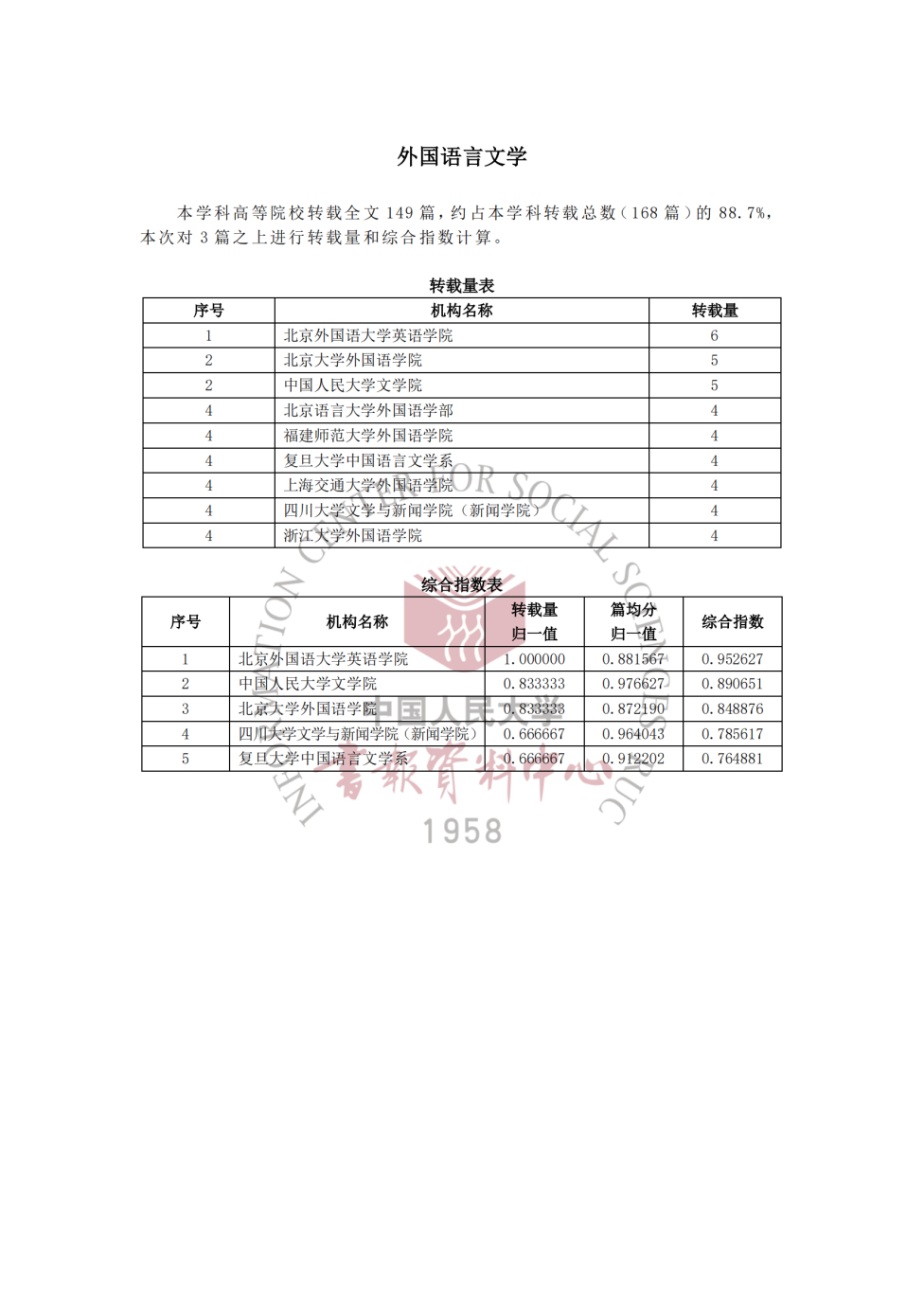 在该研究报告中,“外语语言文学”学科高等院校转载全文149篇,约占本学科转载总数(168篇)的88.7%,本次对机构3篇之上转载量和综合指数进行计算。beats365唯一官方网站在该学科论文的“转载量表”和“综合指数表”均排名第一。