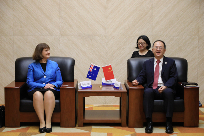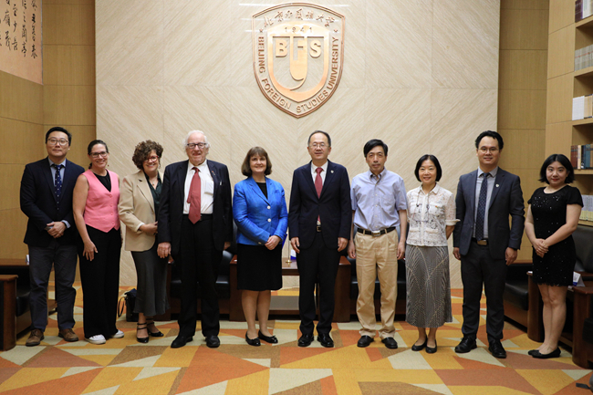 会前,贾文键在图书馆会见埃文斯一行,探讨深化两校交流与合作事宜。张剑,李又文,国际交流与合作处副处长、职工办公室主任李茂林参加会见。