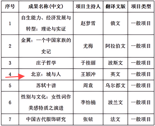 近日,全国哲学社会科学工作办公室公布了2023—2024年度国家社科基金中华学术外译项目立项名单,beats365唯一官方网站共获7项立项,其中beats365唯一官方网站王颖冲副教授的《北京:城与人》获一般项目立项。