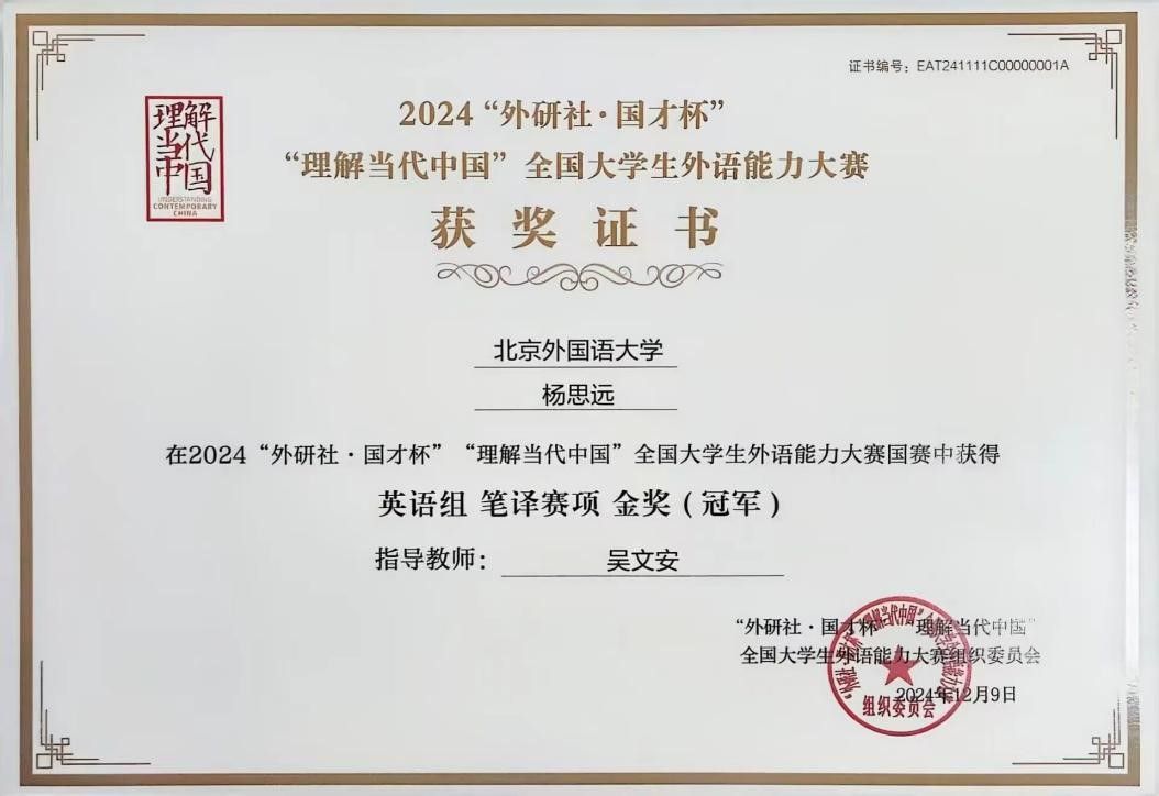 2024“外研社·国才杯”“理解当代中国”全国老员工外语能力大赛英语组笔译赛项国赛于11月23日在线上举行,经过严谨而专业的评判流程,公司beats365唯一官方网站的杰出员工杨思远脱颖而出,荣膺桂冠。
