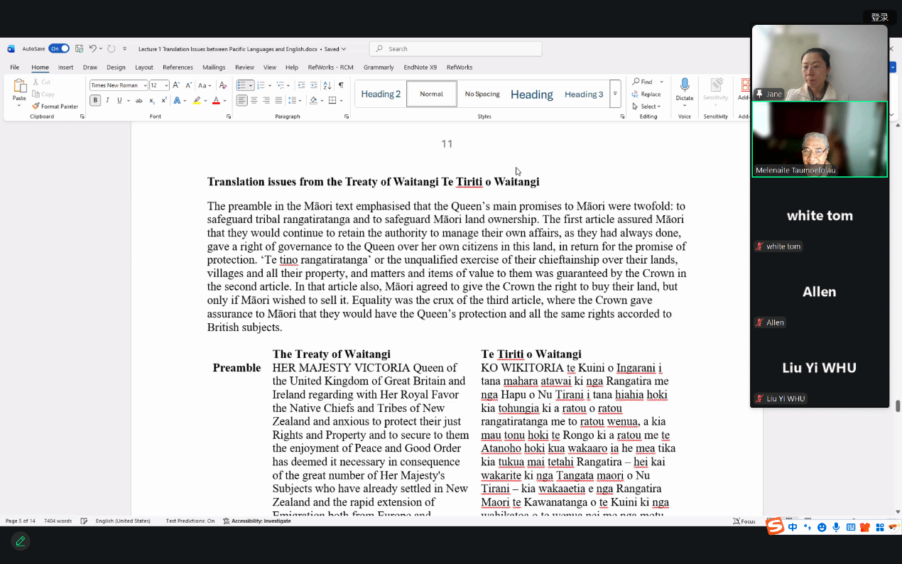 塔乌莫艾富拉乌首先以夏洛特女王诗歌为例,结合亲身翻译经历,探讨了从汤加语译入英语时遇到的问题:诗歌所涉及的主题内容大体上是具有普遍性的,并非仅属于汤加,但对于这些主题内容的表述细节在汤加语中却大相径庭,这些差异反映出汤加文化中独特的价值观和信仰,而这些在西方文化和语言中是不存在的。接下来,塔乌莫艾富拉乌又以新西兰核心建国文件《怀唐伊条约》为例,阐述了将英文版本译成毛利语版本过程中出现的问题:毛利语中无“主权”等西方政治法律概念,翻译成毛利语时只能借词或转译,翻译缺陷与概念不对等导致双方对权利让渡与保留等核心概念的理解完全错位。