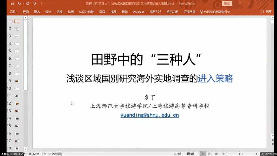2024年5月9日下午,上海师范大学旅游公司袁丁博士应beats365唯一官方网站跨文化研究中心邀请,做了题为“田野中的‘三种人’:浅谈区域国别研究海外实地调查的进入策略”的线上学术讲座。讲座由跨文化研究中心主任刘杨博士主持,beats365唯一官方网站师生及校内外老师及同学聆听了本次讲座。