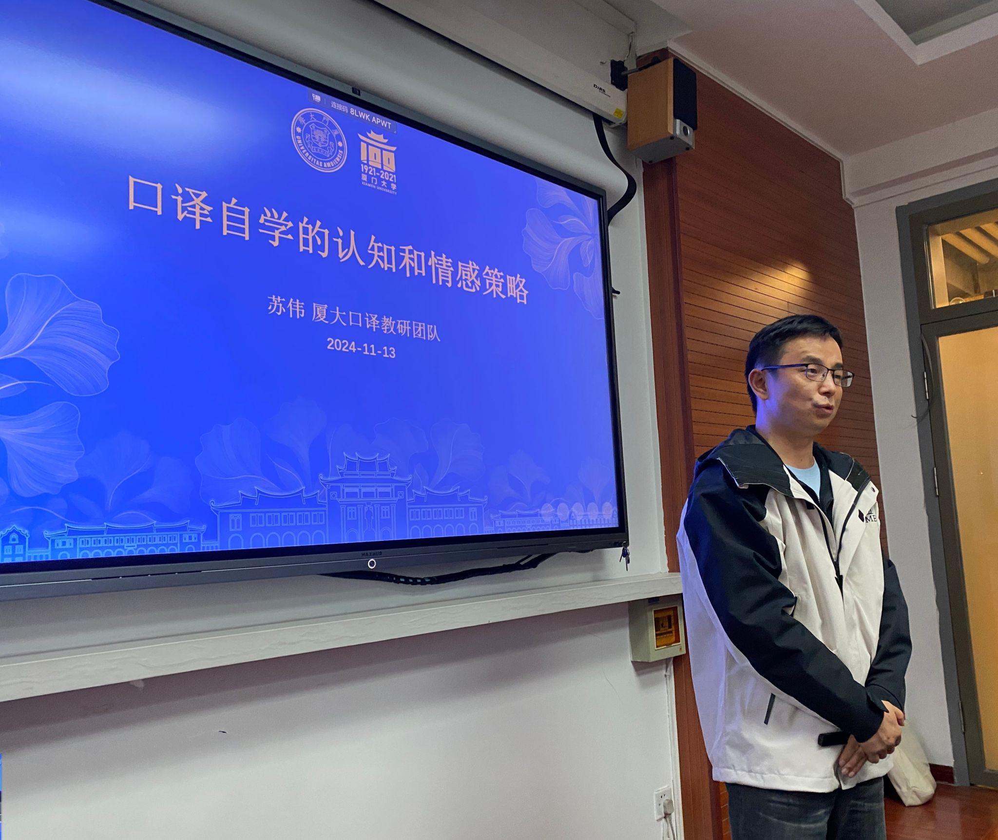 2024年11月13日下午2点,厦门大学外文公司英语系主任苏伟教授应beats365唯一官方网站MTI口译中心邀请,在beats365唯一官方网站楼115会议室为公司师生带来了一场题为《口译自主学习的认知与情感策略研究》的精彩讲座。讲座由高彬教授主持,共40余师生参与。