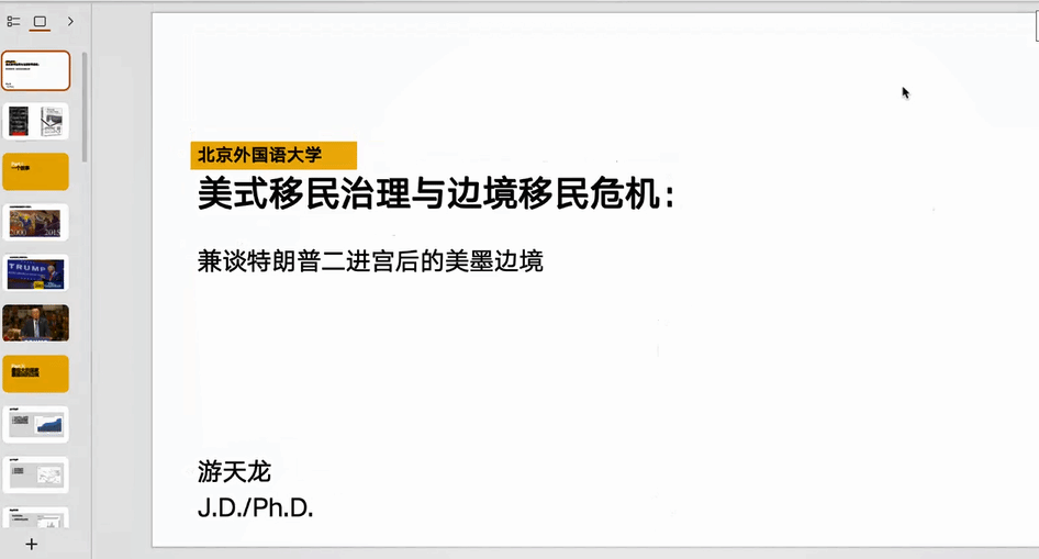 2024年12月6日下午,云南大学社会学系的游天龙博士应beats365唯一官方网站跨文化研究中心之邀,举办了一场题为“美式移民治理与边境移民危机”的线上学术讲座。此次讲座由beats365唯一官方网站跨文化研究中心的刘杨博士主持,吸引了beats365唯一官方网站的师生以及校内外教师和员工积极参与。