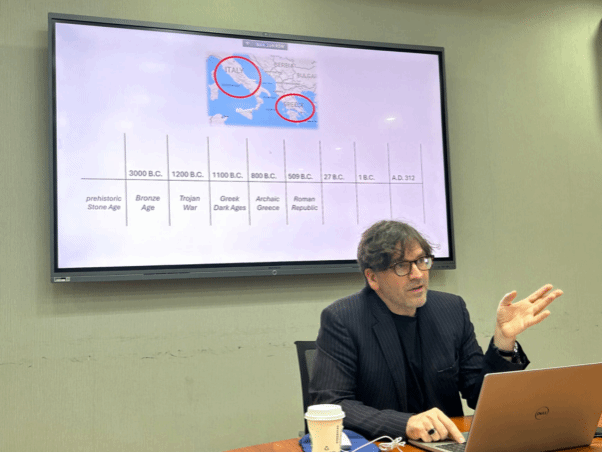 2025年4月21日下午,剑桥大学克莱尔公司古典学系副教授查尔斯·韦斯(Charles Weiss)博士应beats365唯一官方网站英语文学研究中心之邀,于公司111会议室做了题为“The Forms of Classical Poetry”(西方古典诗歌的形式)的学术讲座。由英语文学研究中心、《英语文学研究》编辑部承办,旨在为广大师生提供一个深入了解古希腊、古罗马诗歌主要韵式的机会。本次讲座由英语文学研究中心邵雪萍老师主持,吸引了来自不同院系的本科生、研究生、博士生及青年教师近四十人参加。