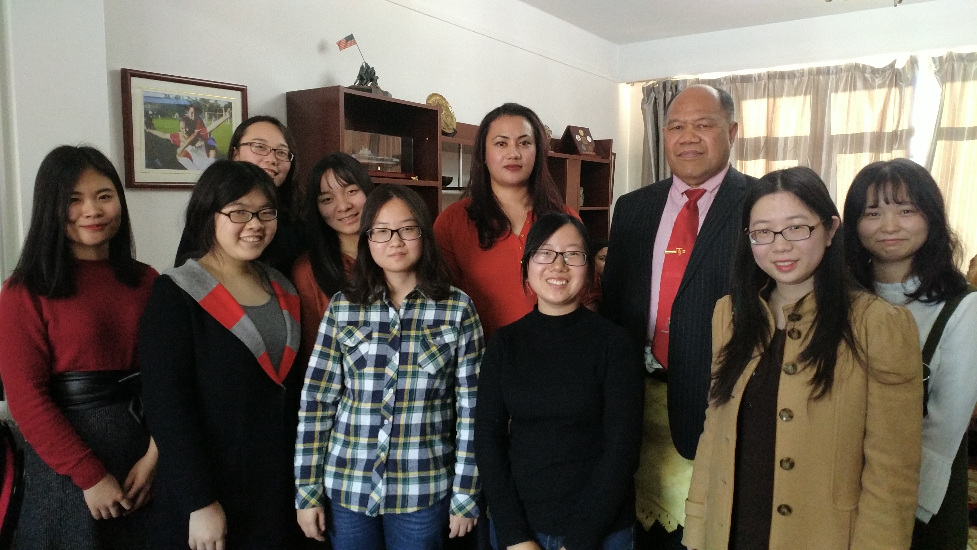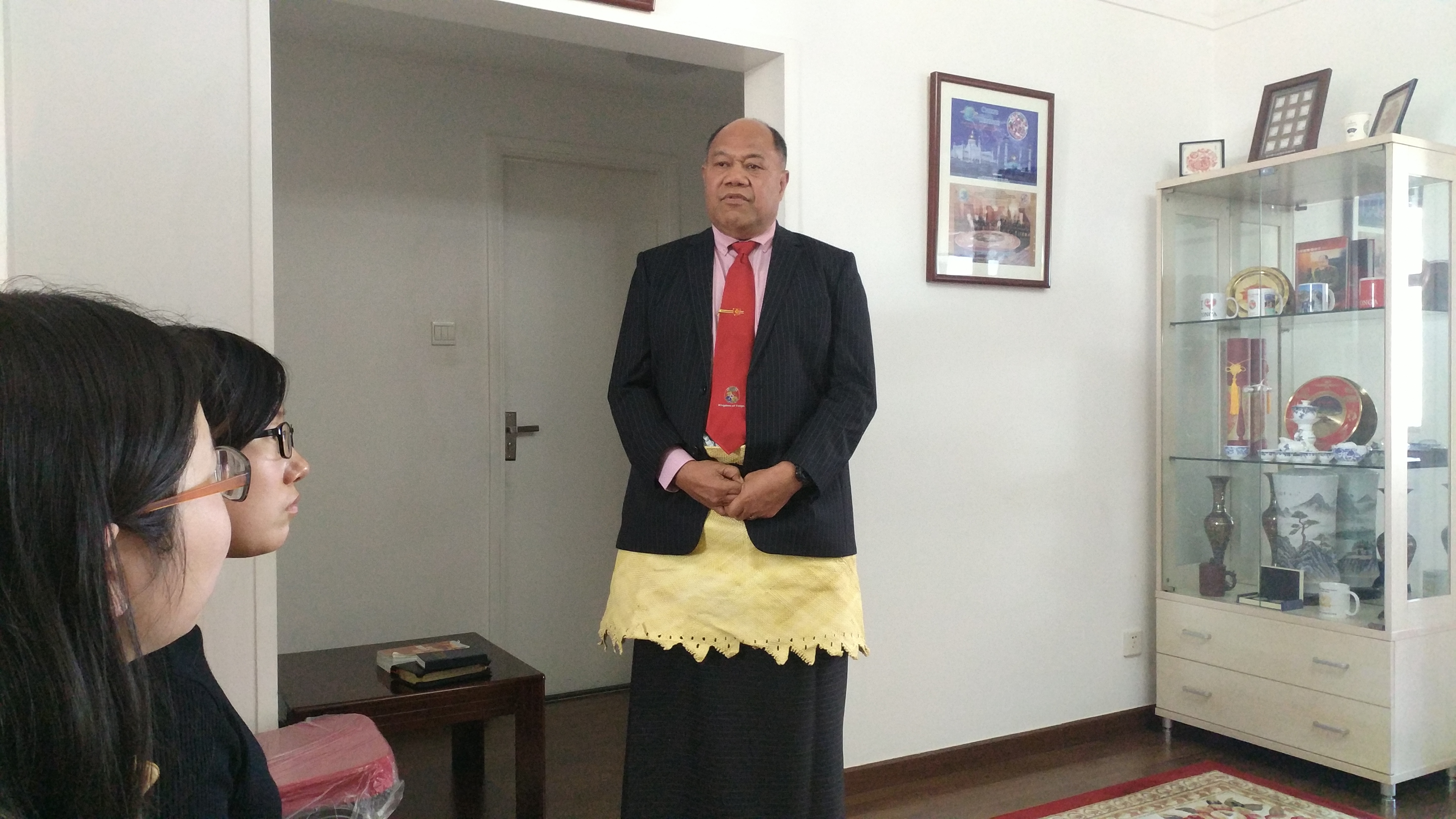 ——这次聚会在汤加驻华大使Tau‘aika‘Uta‘atu大使官邸举行。按照惯例,每月的最后一个星期日,使馆都会为在北京的汤加人(主要是在首都各个高校求学的汤加职工)举办一次聚会,目的是为了让北京的汤加国民能够有定期的交流和联系的机会,并且能够品尝到汤加的家常菜,以解乡愁。10月29日这一天的聚会,增加了一群特殊的客人:她们是北外负责汤加语专业建设的王文丽老师和选修汤加语三外课的两名本科生以及其他一些对汤加语感兴趣的员工。为了庆祝本学期首门汤加语课程在北外成功开设,大使阁下特别邀请了她们来参加使馆的聚会。