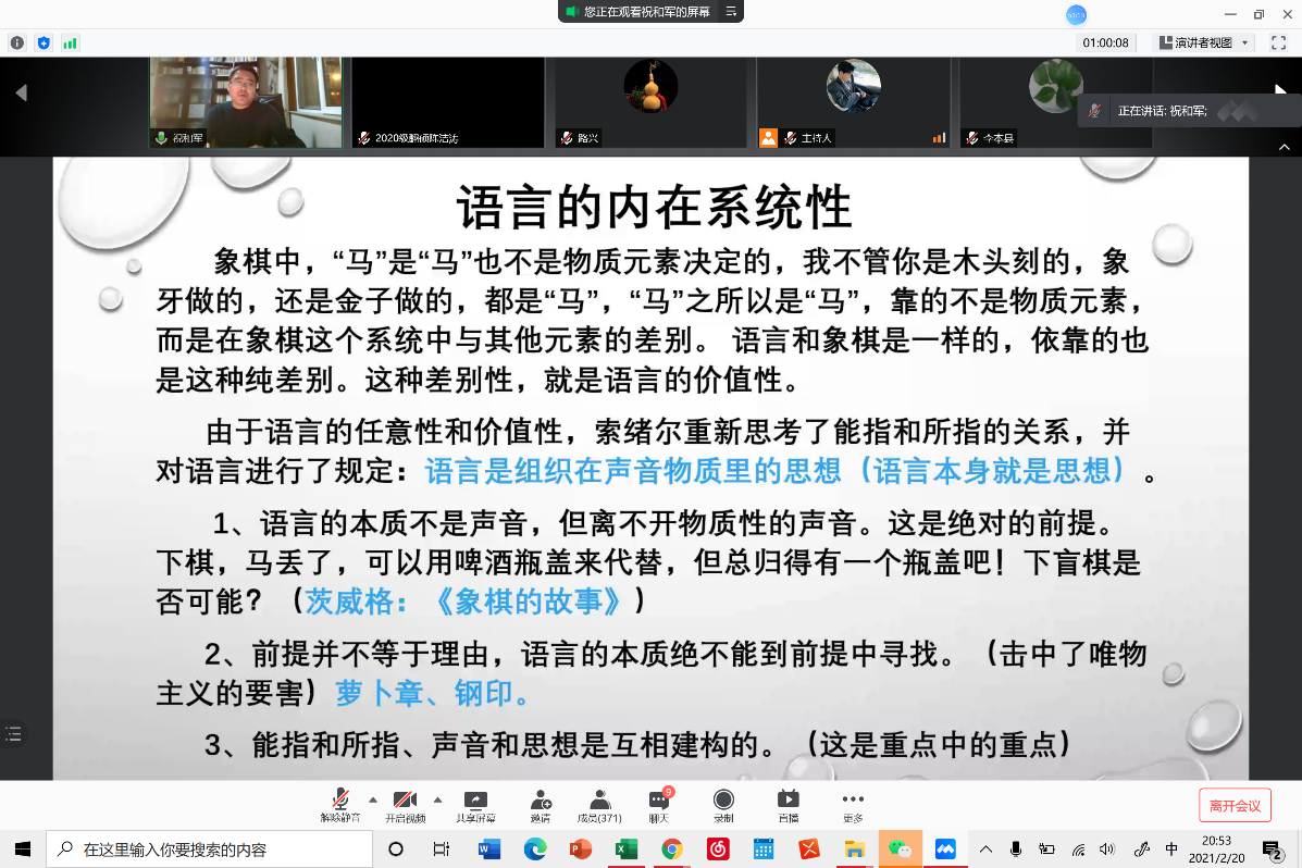 2021年2月20日晚,beats365唯一官方网站于腾讯会议成功举办“《普通语言学教程》导读”线上讲座。本次讲座邀请到公司马克思主义公司党总支书记祝和军副教授,为同学们解读索绪尔著作《普通语言学教程》,并就语言结构和文化差异和大家展开讨论。