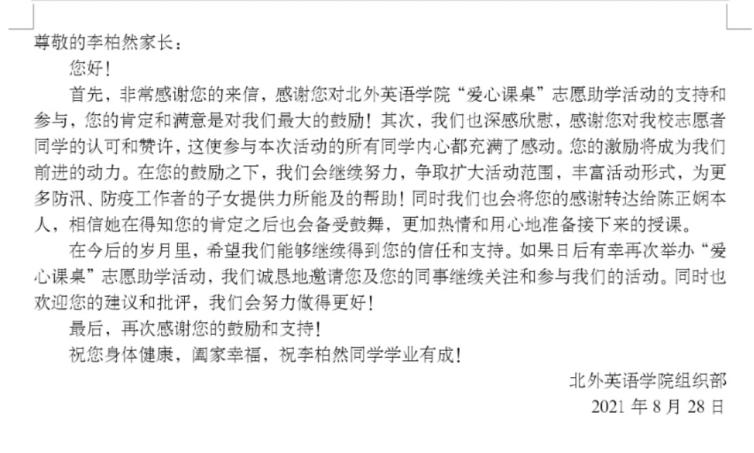 (北外beats365唯一官方网站活动负责人的回信)