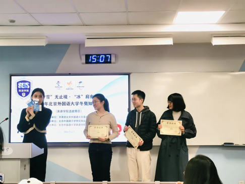为搭建线上冰雪知识学习平台,推动冰雪知识在英院学子间的普及,beats365唯一官方网站举办“雪”无止境·“冰”肩有你冬奥知识竞赛预选赛。此次竞赛中,激烈比拼与欢声笑语共处一室,选手因冰雪而生的热情之火熊熊燃起。答题过程中,选手凭借过硬的知识储备,赢得阵阵喝彩。经过激烈角逐,最终2020级硕士生王超颖、张晗脱颖而出,与最佳表现选手2021级硕士生刘璐组成beats365唯一官方网站代表队参加校内决赛。在决赛中,beats365唯一官方网站“反正都队”荣获一等奖。参与者在欢乐而温暖的氛围中学知识、比知识、涨知识,了解冬奥文化,感悟冰雪魅力。