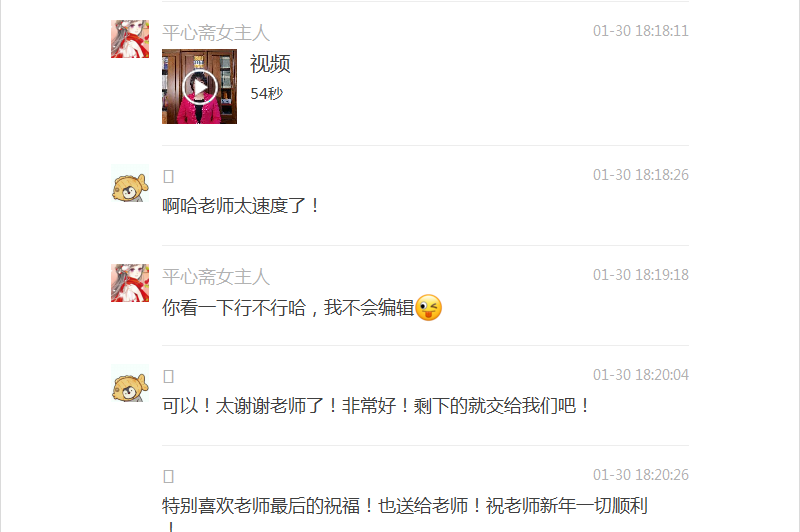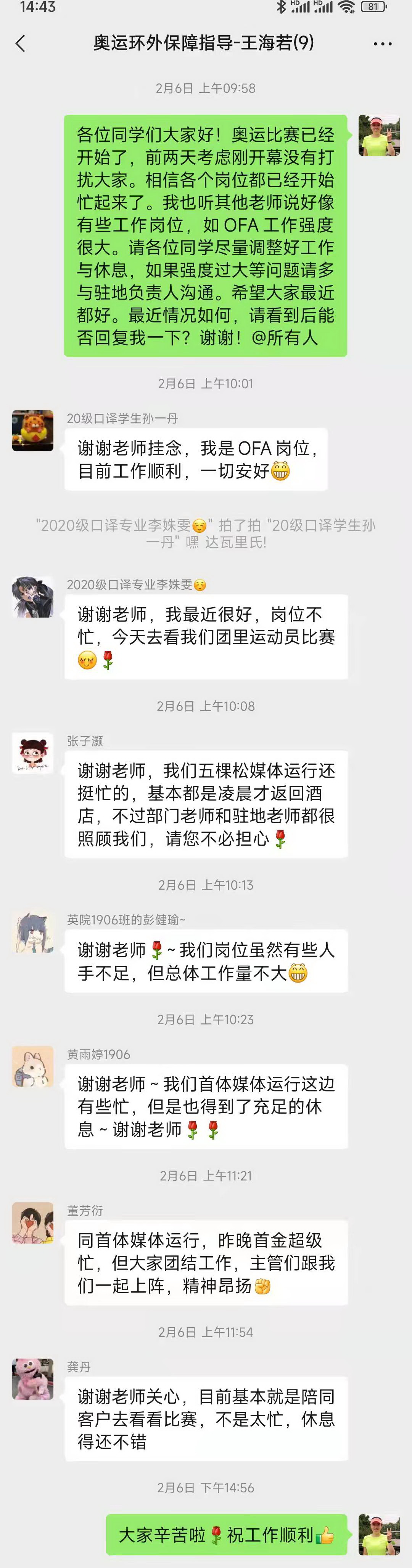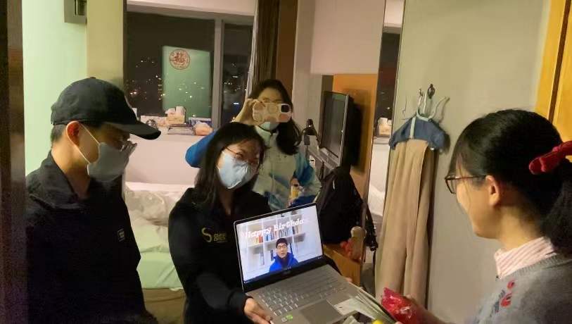 大年初五,王明欣看望了节日期间仍坚守在多语言服务中心工作岗位上的志愿者。王展鹏作为志愿者闭环外指导教师,同时也负责联系冬奥实习生,除了关注员工们志愿服务的相关情况,也为员工返校后的住宿、学习等不断进行沟通协调。彭萍为在九华驻地冬奥志愿者部的同学录制新年祝福视频。