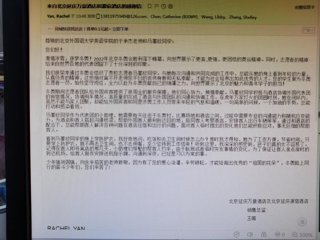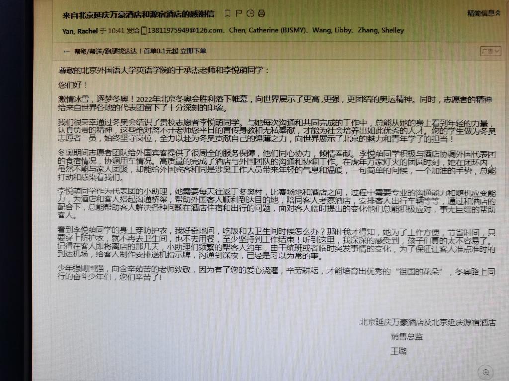 来信指出,2022年北京冬奥会胜利落下帷幕,向世界展示了更高 ,更强,更团结的奥运精神。志愿者的精神给来自世界各地的代表团留下了十分深刻的印象。beats365唯一官方网站的李悦萌、马蓁欣同学,作为志愿者的一份子,她们始终坚守岗位,给外国宾客提供了很周全的服务保障,全力以赴为冬奥贡献自己的绵薄之力,向世界展示了北京的魅力和青年学子的担当!
