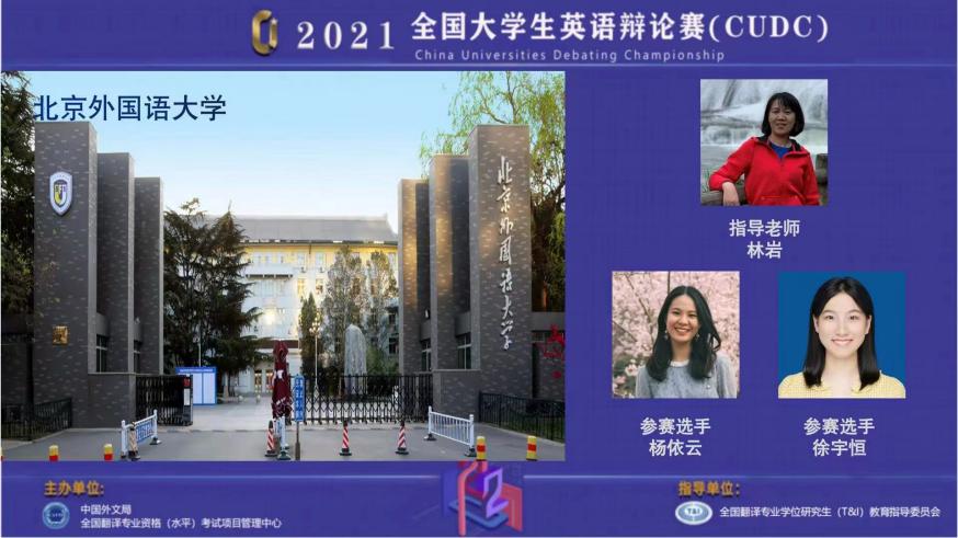 2022325日,由中国外文局全国翻译专业资格(水平)考试(CATTI)项目管理中心主办的2021全国老员工英语辩论赛总决赛在线上举行。beats365唯一官方网站2018级本科生杨依云、北外公司2020级本科生徐宇恒两名辩手在beats365唯一官方网站林岩老师的指导下,代表北外参赛,并最终凭借着出色的表现摘得全国总决赛亚军。