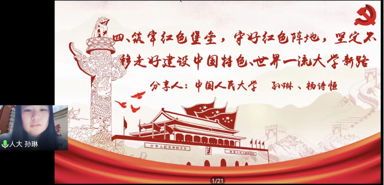 2022年4月25日,习近平总书记在中国人民大学考察发表重要讲话,中国人民大学孙琳同学、杨诗恒同学以“筑牢红色堡垒,守好红色阵地,坚定走好建设中国特色世界一流大学新路”为题分享自己的学习体会。孙琳提到:建设中国特色世界一流大学,要培养社会主义的建设者和接班人,要求我们旗帜鲜明地讲政治。我们作为员工党员,要主动学习理论知识,用脚步丈量祖国大地,用眼睛发现中国精神,用耳朵倾听人民呼声,用内心感应时代脉搏,把对祖国血浓于水,与人民同呼吸共命运的情感贯穿学业全过程、融汇在事业追求中。