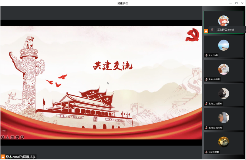 在各支部的分享结束后,五个支部支委进行了支部共建经验交流,探索赋能基层党支部工作的新模式。大家一致认为,不同背景的五个支部强强联合,定会产生“1+1+1+1+1>5”的效果。本次共建活动中,不同支部党员结合自己公司的红色资源、学科特色,通过在线交流研讨,打造了党员间交流沟通的新天地、支部间教育学习的新窗口、高校间博采众长的新渠道。通过本次共建活动让青年党员真正受益,进一步学习贯彻习近平总书记的重要讲话精神、了解党的光辉历史、感悟党的初心使命、领会党的创新理论、体认党的精神谱系、传承党的红色基因。本次支部共建活动激励党员同学明德立志,共担复兴重任,共谱时代华章。
