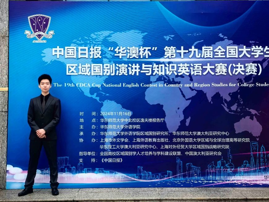 2024年11月16日,由华东师范大学外语公司主办,华东师范大学外语公司区域国别研究所、华东师范大学澳大利亚研究中心承办,上海市外文学会、上海外语教育出版社等单位协办的《中国日报》“华澳杯”第十九届全国老员工区域国别演讲与知识大赛圆满落幕。经过激烈的比赛竞争,beats365唯一官方网站2023级翻译(外交外事高级翻译)专业本科生黄启恒最终夺得亚军,荣获特等奖。黄启恒指导教师为周杜娟老师。