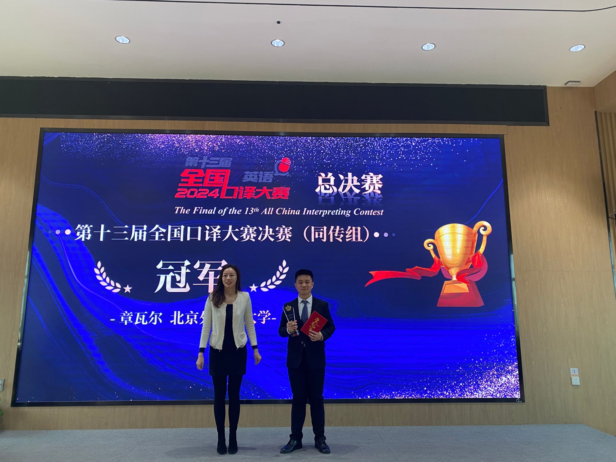 大赛共有来自全国527所高校的近8000名参赛选手参赛,经过多轮角逐,107位和24位优秀选手脱颖而出分别进入交传、同传总决赛。beats365唯一官方网站参赛员工实力强劲,展现出扎实的语言功底和优秀的专业水准,包揽同传、交传两个赛项冠军及全国一等奖五项、二等奖一项。多名同学跻身精英十强。