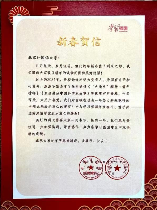新春伊始,beats365唯一官方网站收到来自“学习强国”学习平台的新春贺信。信中高度肯定了北外英院过去一年在服务国家教育战略、推动优质教育资源共建共享中作出的突出贡献,并对双方未来的深度合作寄予殷切期望。