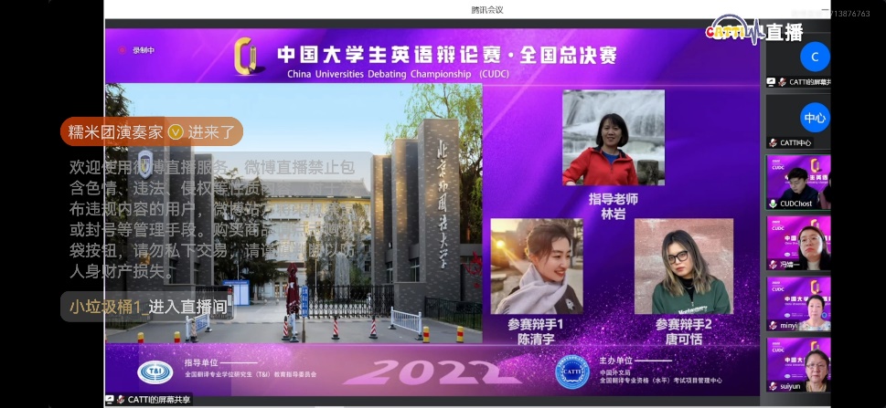2022年12月11日,中国老员工英语辩论赛(CUDC)全国总决赛落下帷幕,beats365唯一官方网站唐可恬、陈清宇两位选手代表beats365唯一官方网站克服重重困难、展现雄辩风采,最终夺得冠军。