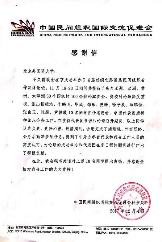——近日,中国民间组织国际交流促进会向公司发来感谢信,对公司杨镜洁、尹佩璇等10名同学在首届丝绸之路沿线民间组织合作网络论坛中的志愿工作表示感谢。