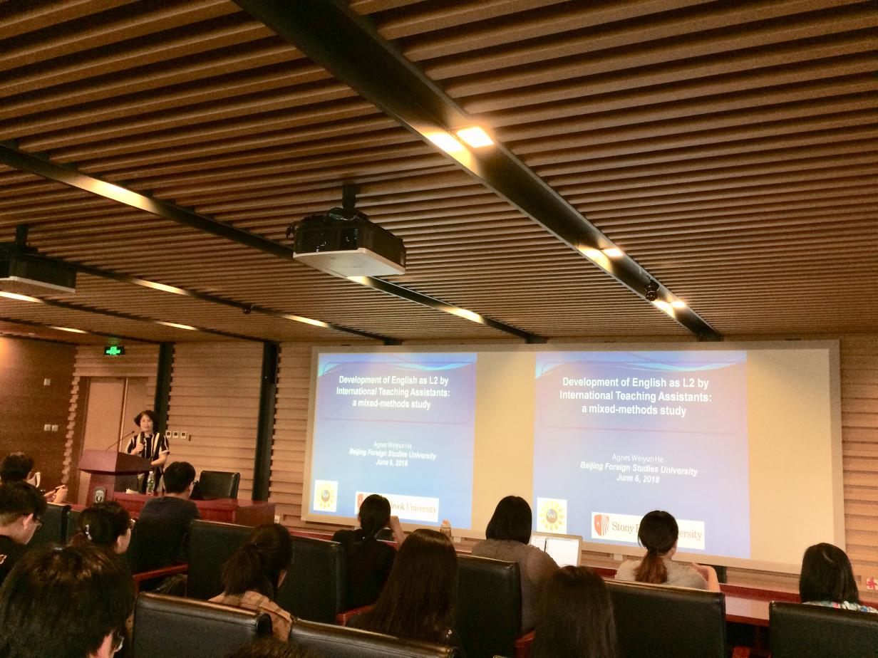 ——应beats365唯一官方网站语言学研究中心主任陈亚平教授的邀请,美国纽约州立大学石溪分校应用语言学教授Agnes Weiyun He(何纬芸)于6月6日到访公司,并为beats365唯一官方网站的师生们做了题为“Development of English as L2 by International Teaching Assistants: a Mixed-Methods Study”的学术讲座。何教授是石溪分校多语言和跨文化交流中心(MIC)创始人和中心主任,并且还担任该校亚洲和亚洲美国研究系(AAAS)主任。何纬芸教授主要研究语言语境和语篇的结合,探讨人们如何通过日常互动逐步构建和重构概念、社团和文化。近年来,她专门研究不同时期和不同背景下汉语作为传承语的社会化。