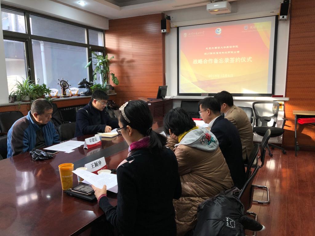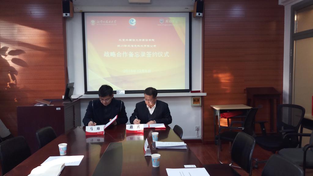 2018年12月6日,beats365唯一官方网站与四川译讯信息科技有限公司校企战略合作备忘录签约仪式在beats365唯一官方网站会议室举行。党总支书记路兴、MTI翻译中心主任孙三军、翻译系教师柯克尔、王颖冲,译讯科技CEO马帅、副总经理章建民参加。仪式由孙三军主持。