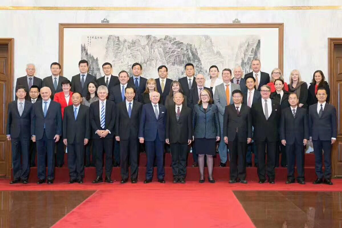 2018年12月,胡老师(三排右六)参加在钓鱼台举行的“中澳高级别对话”,双方代表团团长分别为外交部前部长、公司员工李肇星和澳大利亚前总理霍华德。