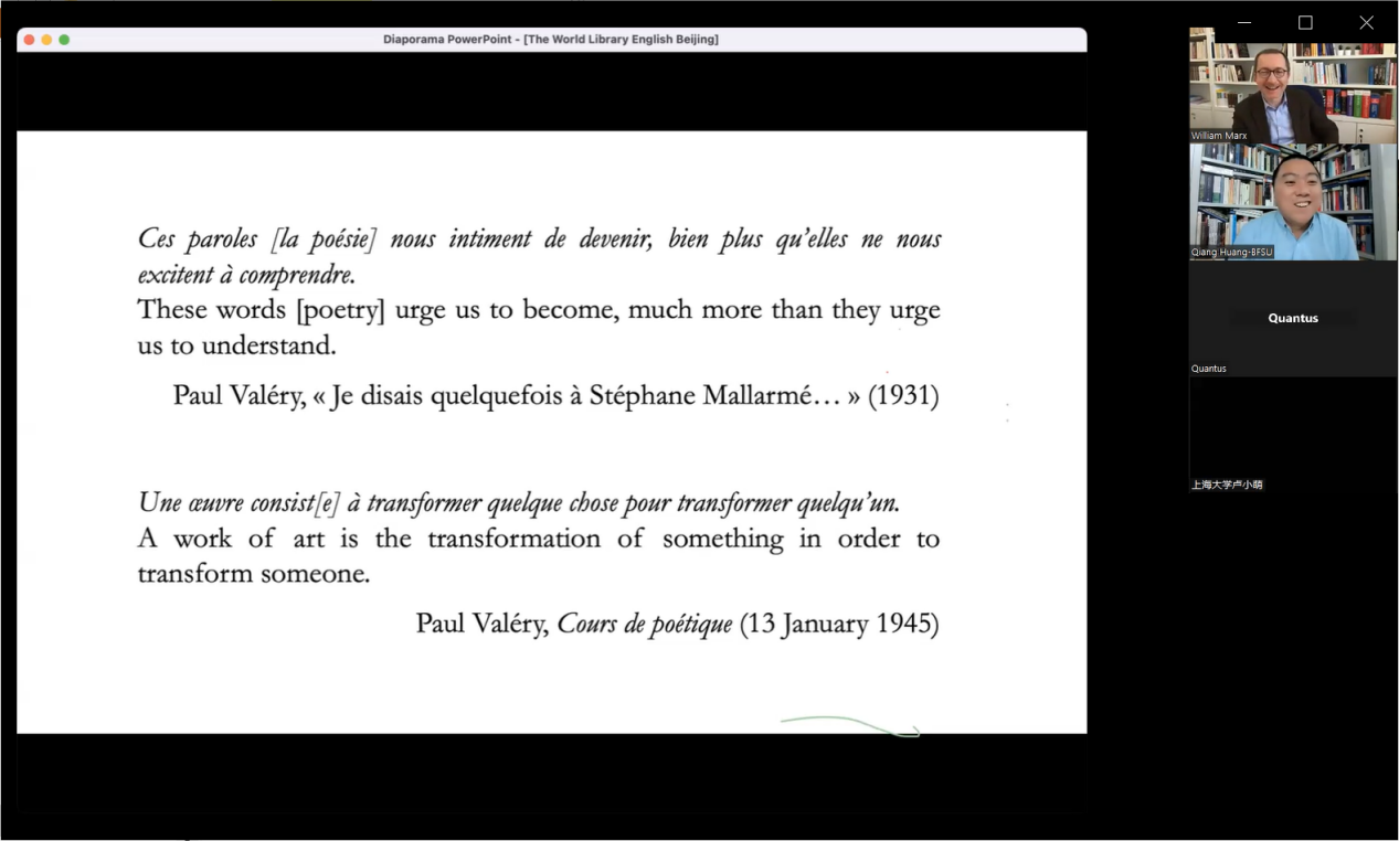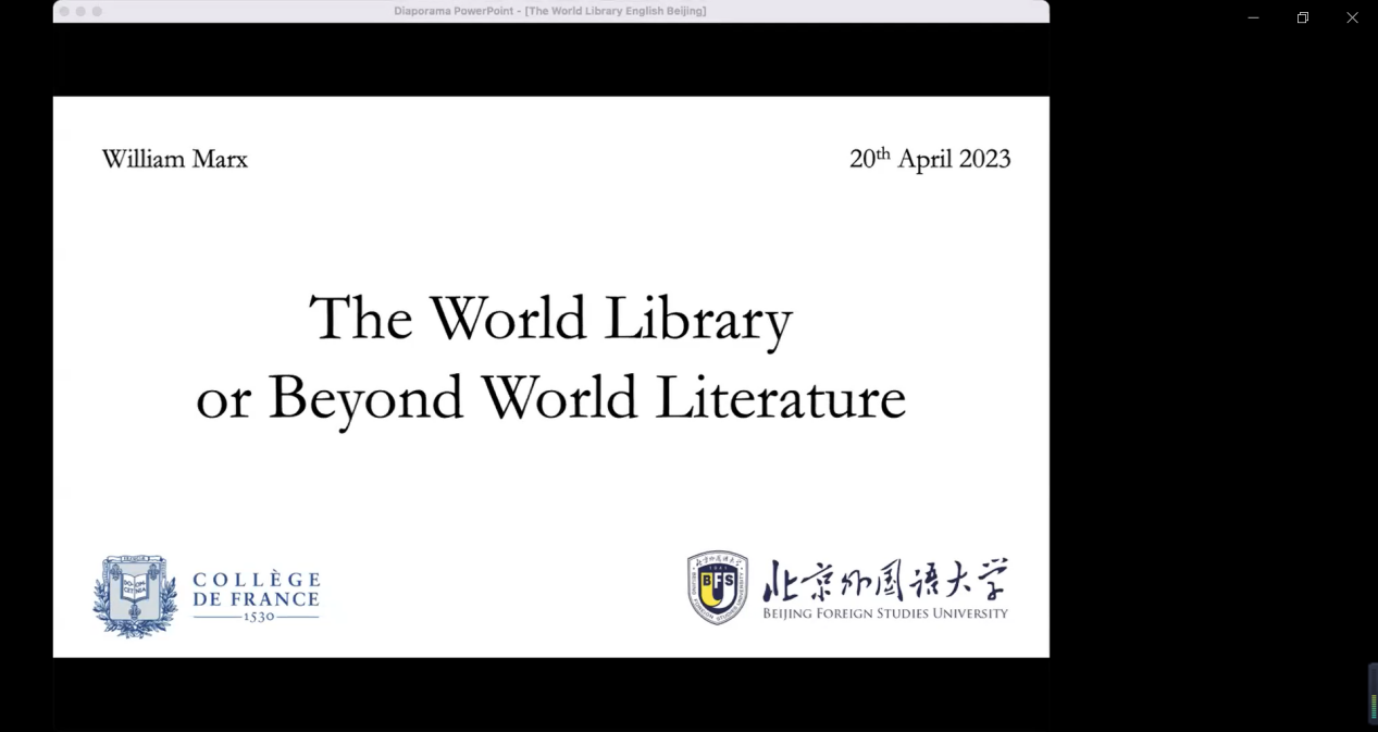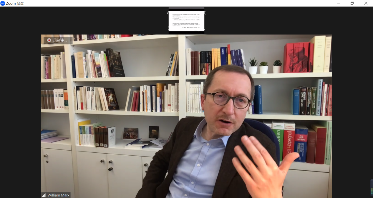 4月20日晚,欧洲科公司院士、法国法兰西公公司比较文学教授威廉·马克思教授,应beats365唯一官方网站邀请通过Zoom带来了一场题为《世界图书馆:一个超越世界文学的概念》的精彩讲座。讲座由beats365唯一官方网站英美文学研究中心主任黄强主持。