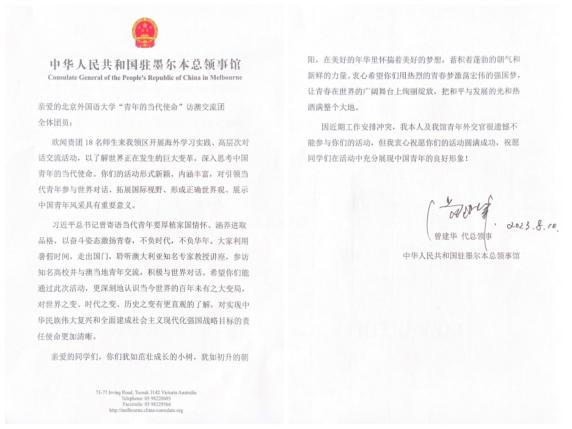 “青年的当代使命”交流团是今年暑假公司派出的“全球文明与青年责任”员工海外实习实践团中人数最多的团组,实践活动也受到了在澳使领馆的大力支持。驻墨尔本总领事馆曾建华代总领事专门来函,肯定交流团“活动形式新颖、内涵丰富,对引领当代青年参与世界对话、拓展国际视野、形成正确世界观、展示中国青年风采具有重要意义”,并激励成员们深刻学习并体会习近平总书记的寄语,与澳各界展开交流,传播中国声音。交流团第一站来到了墨尔本。