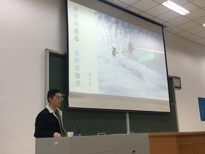 赵运哲同学介绍外交部遴选经验和在蒙特雷翻译公司学习的经历。他告诉同学们,外交部遴选主要考察申论、行政能力测试、英语笔试和口试和面试。英语笔试口试要多学习政论文献、俚语翻译,多看经济学人的文章。他还提醒同学们,口试和面试时切记保持良好的应试心态。为同学们推荐了几个公众号:“外交部发言人办公室”,“英文巴士”和“翻吧”等,可以学习时政英语翻译,锻炼个人视译能力。