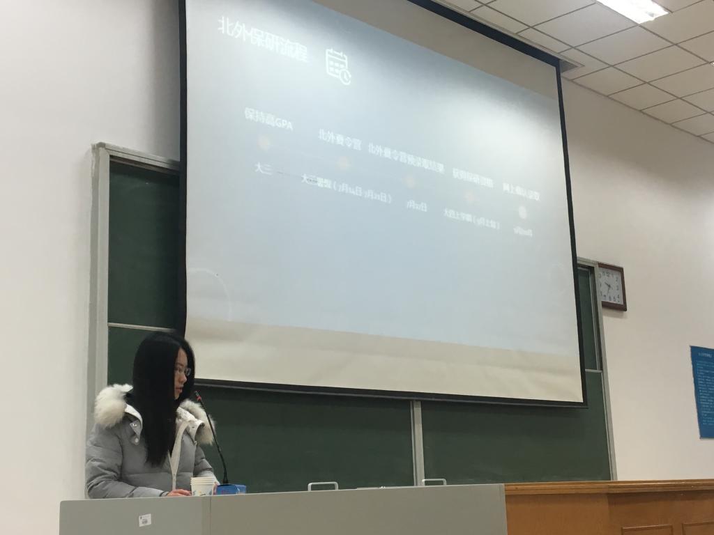 最后与同学们分享经验的是保研到北外国际商公司的吕芸萌学姐。她告诉同学们大三要学好专业课,在暑假积极参加北外国际组织夏令营或者其他公司的夏令营。同时介绍了北外夏令营申请的条件和录取情况。