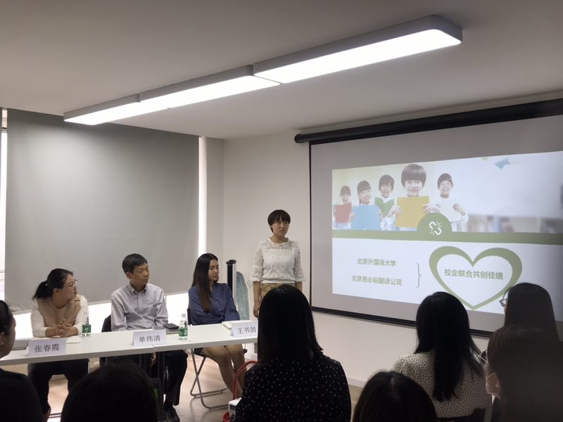 之后思必锐翻译公司总经理单伟清与英院师生亲切座谈,英院员工刘雅堃、鲁弥弥、张亚娟,思必锐翻译公司相关职能部门人员参加了座谈会。三位员工介绍了她们毕业后在思必锐翻译公司工作的情况,刘雅堃和张亚娟担任翻译项目经理,负责业务洽谈、业务分配和后续跟进等,鲁弥弥是专职翻译,主要负责人文艺术类翻译。她们建议在校生要多读书,不断提升自己的翻译能力,但作为专业翻译人员,在广的基础上,也要专,要有自己擅长和感兴趣的领域。员工们还回答了师弟师妹的问题,如关于中译外和外译中对于翻译人员的要求,计算机辅助翻译在实际工作中的应用,公司对翻译人员的招聘要求等问题。三位员工耐心地解答了问题,尤其讲了计算机辅助翻译在实际工作中也会用到,但最后必须人工校译,成稿不能有机器翻译痕迹,有些涉密文件更是禁止用翻译软件。
