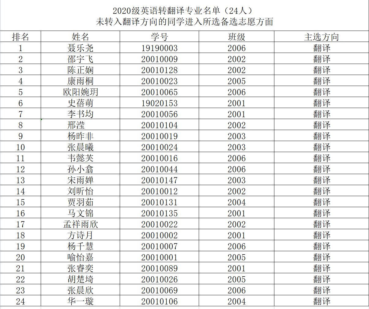 关于拟同意2020级本科生转翻译方向公示书