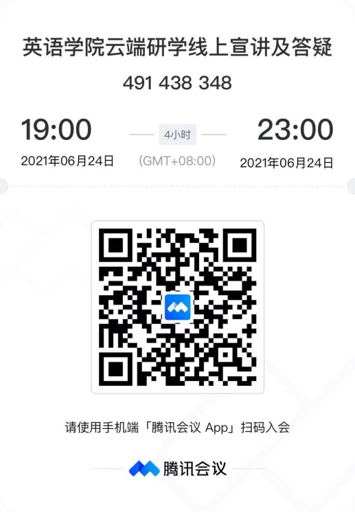 为方便各位同学报考北外beats365唯一官方网站“云端研学活动”,beats365唯一官方网站将在6月24日(本周四)晚19:00举行线上宣讲和答疑活动,腾讯会议号为491 438 348,没有密码,二维码如下所示。欢迎广大同学参加!